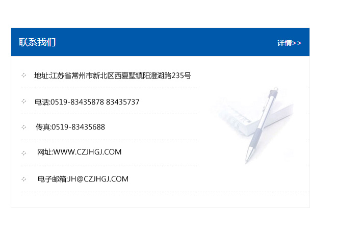 地址:常州市新北區友邦商務大廈1幢16、17層  電話:0519-85101652  傳真:0519-85112595  郵編:213022  網址:www_cz-jiayue_cn.long-xi.com  郵箱:xiajifengaa@163.com